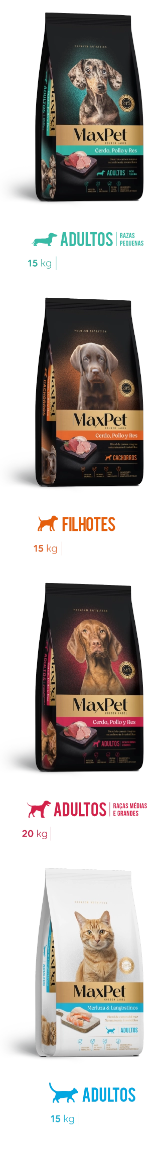 Gatos adultos: 0,5 kg, 10 kg e 15 kg.